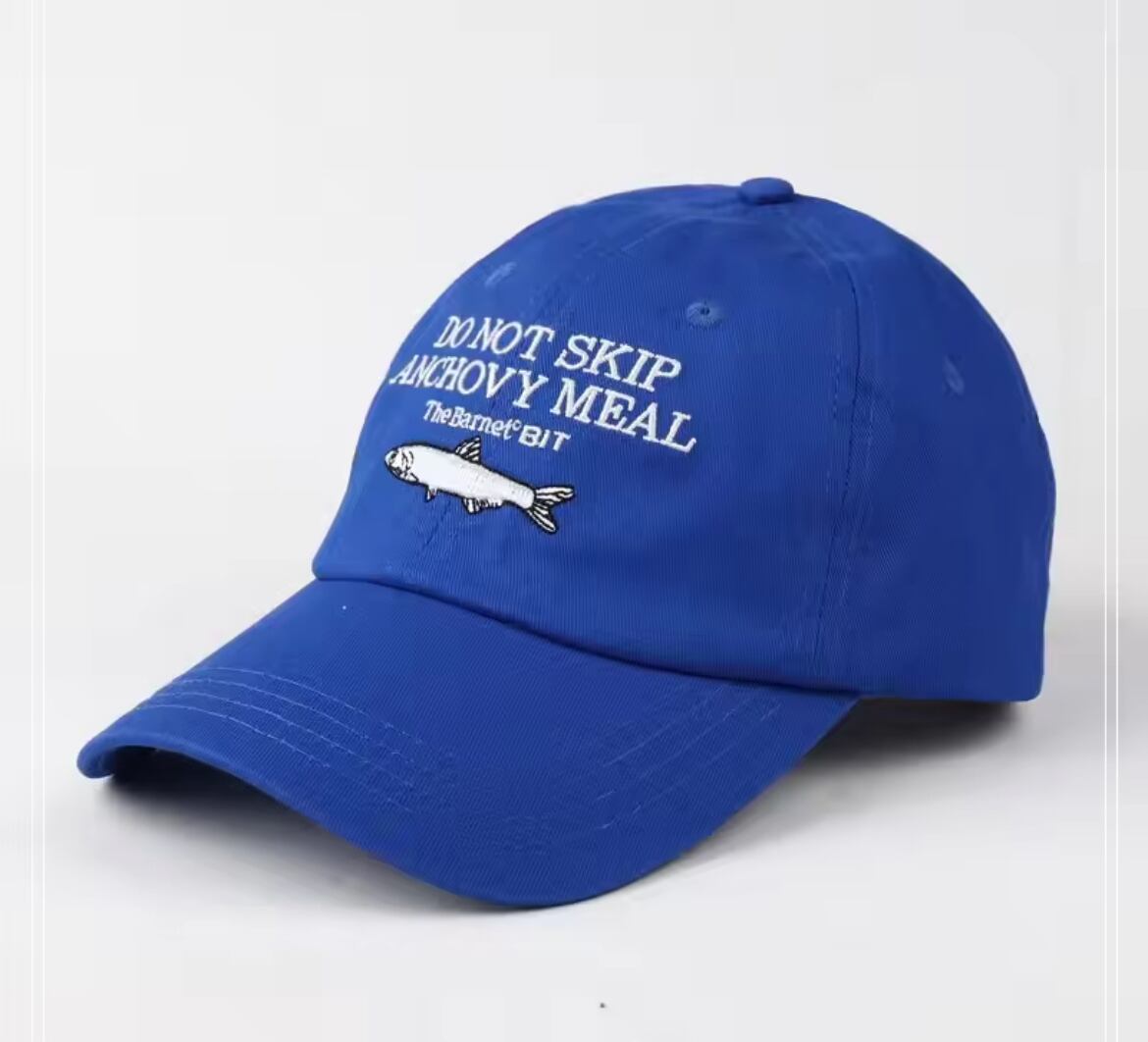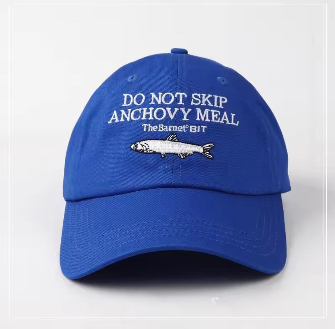 この可愛らしい「DO NOT SKIP ANCHOVY MEAL」キャップは、シンプルなコーディネートに楽しいアクセントを加えてくれます。友達とのお出かけや、カジュアルな日常使いにもぴったりです!マリンスタイルからストリートファッションまで、幅広く活躍します。